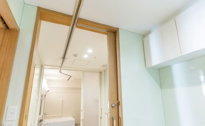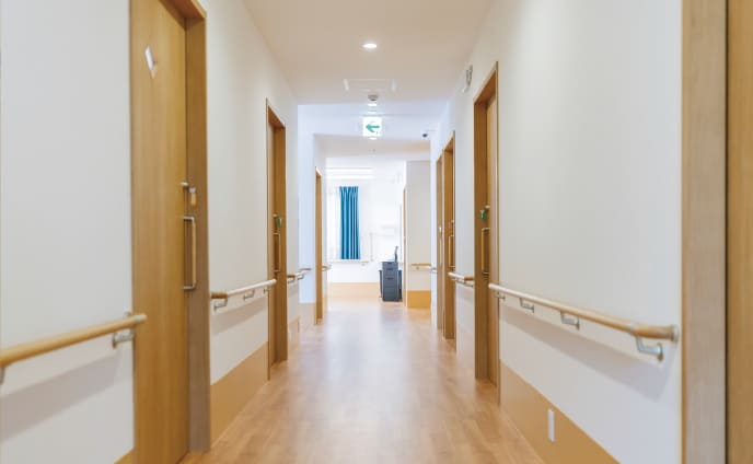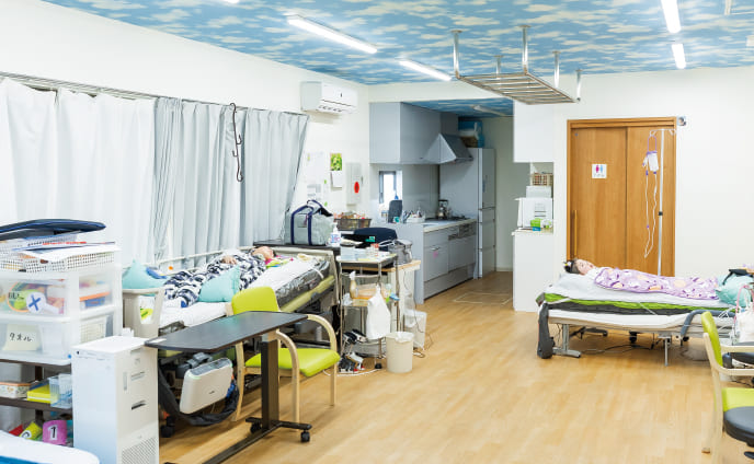 6名の方が共同生活する利用者様の生活拠点です。日中の時間をあんさんぶるのデイサービス施設などで過ごし、夕方になるとしゃるーるに帰宅。晩ご飯を食べてぐっすり眠ります。夜間はスタッフ2名体制で見守り。IT機器で就寝中の心拍チェックをする設備なども充実しています。